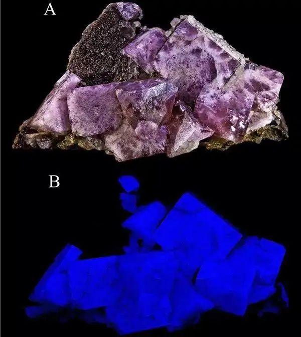 熒光,最初是在螢石身上發現的。某些紫色螢石在紫外線的照射下會呈現出藍色,完全不同于它在日光下的顏色。除此之外,一些方柱石、方解石、石膏、方鈉石、水砷鋅礦、文石等也會產生熒光效應,但是地質學家總結的經驗是,用熒光效應來判別礦物并不十分靠譜,因為只有極少數礦物具有這種特征,即使這些礦物產自同一個礦區,也不一定都能產生熒光。