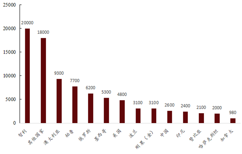 全球銅資源儲(chǔ)量分布較集中,據(jù)USGS數(shù)據(jù),2022年全球銅儲(chǔ)量8.9億噸,其中智利、澳大利亞、秘魯儲(chǔ)量規(guī)模居前,分別占比21%、11%、9%,CR3達(dá)到 41%。從供應(yīng)來(lái)看,智利、秘魯、剛果(金)為全球銅礦最重要的供給來(lái)源,2022年銅礦產(chǎn)量分別達(dá)520、220、220萬(wàn)噸,占全球銅礦供給分別 24%、10%、10%。值得注意的是,智利正面臨礦山老化、品位下降的問題,年產(chǎn)量于2018年見頂于583 萬(wàn)噸,隨后逐年下滑;秘魯2019年產(chǎn)銅246萬(wàn)噸,隨后受疫情和當(dāng)?shù)卣值纫蛩財(cái)_動(dòng)有所減量,也在逐年下滑,2022年產(chǎn)量220萬(wàn)噸;而非洲代表國(guó)家剛果(金)銅供給增量顯著,逐漸成長(zhǎng)為最重要的供給國(guó)之一,年產(chǎn)量從2012年的60萬(wàn)噸增長(zhǎng)到2022年的220 萬(wàn)噸,與老牌產(chǎn)銅國(guó)秘魯相當(dāng)。