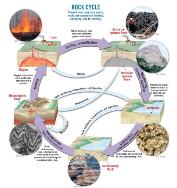 巖石的誕生:巖石是由礦物或礦物質的天然聚合物組成。它們通過一系列地質過程形成,始于巖石循環。這個循環包括三種主要類型的巖石:火成巖、沉積巖和變質巖。火成巖源自于熔融巖漿,可以是在地表以下冷卻而成的(侵入巖)或在地表上凝固而成的(噴發巖)。沉積巖是由沉積物積累和壓實而形成的。而變質巖是指之前存在的巖石經歷了高溫高壓作用,發生了變質。