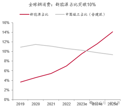 新能源領(lǐng)域?qū)︺~需求的增量,已基本上抵消了國內(nèi)傳統(tǒng)房地產(chǎn)下滑所帶來的負(fù)面影響。近日,中泰證券研究所有色金屬首席分析師謝鴻鶴曾表示,2023年全球新能源制造對銅鋁的消費量已經(jīng)占到總消費量的10%,而國內(nèi)房地產(chǎn)竣工端對銅鋁(指狹義的直接使用部分)的消費也在2023年被“壓縮”到了10%附近。