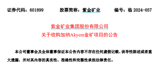 2024年10月9日,紫金礦業(yè)宣布擬出資10億美元(約70.71億人民幣)收購紐蒙特全資子公司Newmont Golden Ridge Ltd的100%股權(quán),拿下加納Akyem金礦項目的全部權(quán)益。這是紫金礦業(yè)自2020年以來的第7宗金礦并購,標(biāo)志著公司在全球金礦布局的持續(xù)加強(qiáng)。Akyem金礦擁有黃金資源量54.4噸,儲量約34.6噸,年均產(chǎn)金約5.8噸。