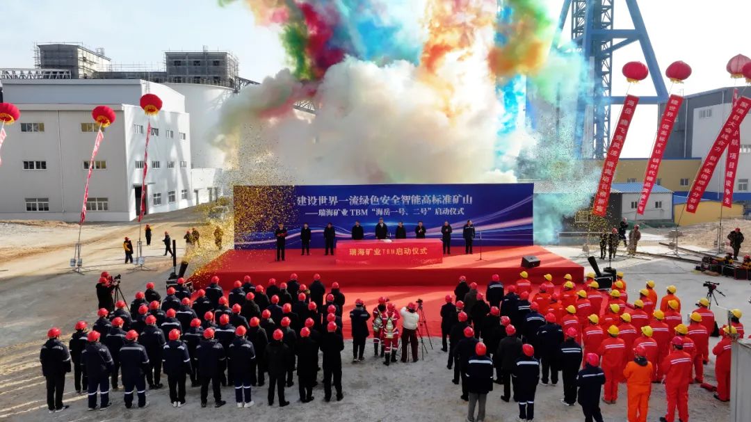 2024年12月30日上午9時36分,瑞海礦業(yè)有限公司副井井塔前嘉賓齊聚、彩球飄飄、旌旗獵獵,十二條巨幅標(biāo)語迎風(fēng)招展,兩臺TBM(全斷面硬巖隧道掘進(jìn)機(jī))啟動儀式揭幕,瑞海礦業(yè)總經(jīng)理于明海、浙江省隧道工程集團(tuán)公司副董事長黃德祥、山東招金礦業(yè)股份有限公司董事長姜桂鵬先后作了發(fā)言和致辭。上午10時,隨著萊州市政府副市長邱召明宣布“萊州市瑞海礦業(yè)有限公司‘海岳一號、海岳二號’TBM發(fā)車”,萊州市政府副市長邱召明,招遠(yuǎn)市政府副市長荊興業(yè),山東招金集團(tuán)有限公司副董事長、總經(jīng)理王樂譯,招金礦業(yè)董事長姜桂鵬等嘉賓共同按下啟動球。