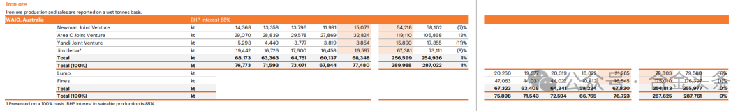 銷量方面,2025年第二季度,皮爾巴拉業(yè)務鐵礦石總銷量(100%基準)為7672.3萬噸,環(huán)比上漲14.9%,同比上漲1.1%;其中BHP所屬權益下,粉礦銷量4654.5萬噸,塊礦銷量2128.5萬噸。