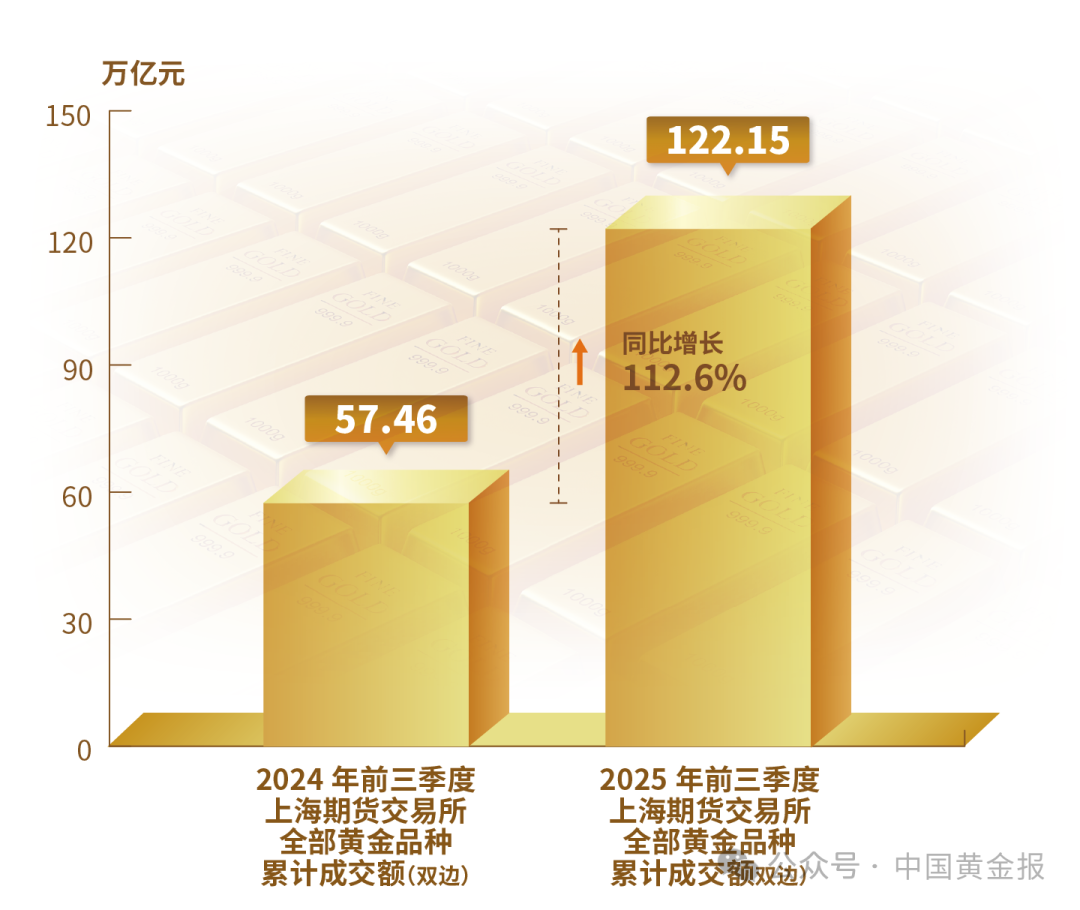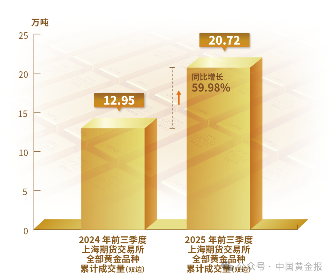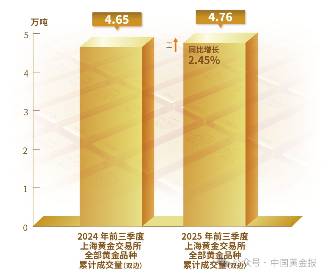 不同品類黃金產(chǎn)品的表現(xiàn)差異明顯。輕克重、附加值高的首飾產(chǎn)品仍保持較強(qiáng)市場(chǎng)吸引力,銷售情況較好。金條需求仍然旺盛,地緣沖突加劇與經(jīng)濟(jì)不確定性使得黃金避險(xiǎn)保值的功能進(jìn)一步凸顯。電子、新能源等產(chǎn)業(yè)的快速發(fā)展使得工業(yè)用金需求穩(wěn)步回升。 黃金市場(chǎng) 2025年前三季度,上海黃金交易所全部黃金品種累計(jì)成交量單邊2.38萬噸(雙邊4.76萬噸),同比上升2.45%;累計(jì)成交額單邊17.68萬億元(雙邊35.35萬億元),同比上升41.55%。上海期貨交易所全部黃金期貨期權(quán)累計(jì)成交量單邊10.36萬噸(雙邊20.72萬噸),同比上升59.98%;累計(jì)成交額單邊61.08萬億元(雙邊122.15萬億元),同比上升112.6%。