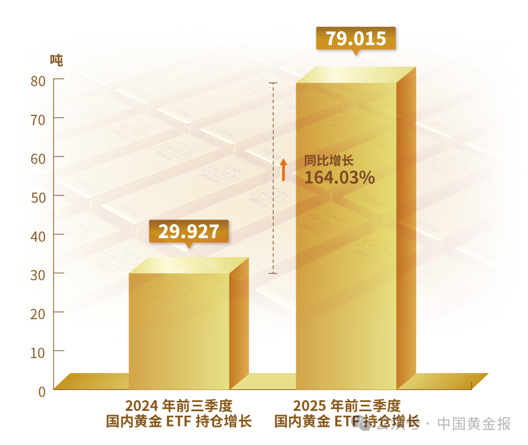 2025年前三季度,國內(nèi)黃金ETF增倉量為79.015噸,較2024年前三季度增倉量29.927噸,同比增長(zhǎng)164.03%。至9月底,國內(nèi)黃金ETF持倉量為193.749噸。