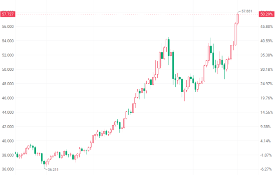 白銀市場表現強勁,Wind數據顯示,12月1日,國際銀價一度突破57美元/盎司關口,再創新高;COMEX白銀首次突破58美元/盎司;滬銀主力合約盤中最高漲超7%,達13520元/千克,創下新高。今年以來,國際銀價已上漲超90%,大幅跑贏黃金。